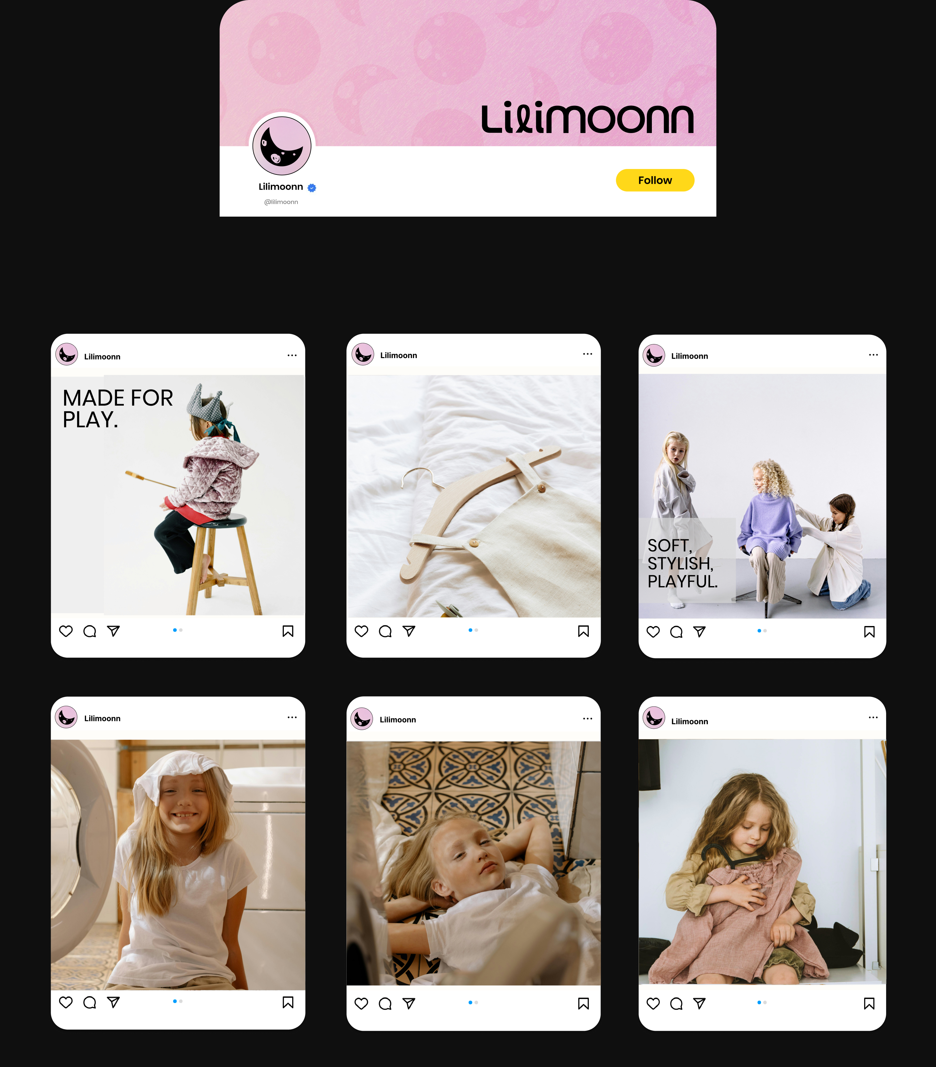 The design direction was inspired by Lilimoonn’s commitment to premium materials and high-quality craftsmanship. I used a pastel color palette with smooth gradients to convey softness and care, complemented by black elements to create contrast and sophistication. Yellow and pink accents introduce a joyful, childlike energy, ensuring the visual tone stays playful yet elegant. The minimalist layout highlights the products and brand identity, reinforcing Lilimoonn’s refined, modern aesthetic.