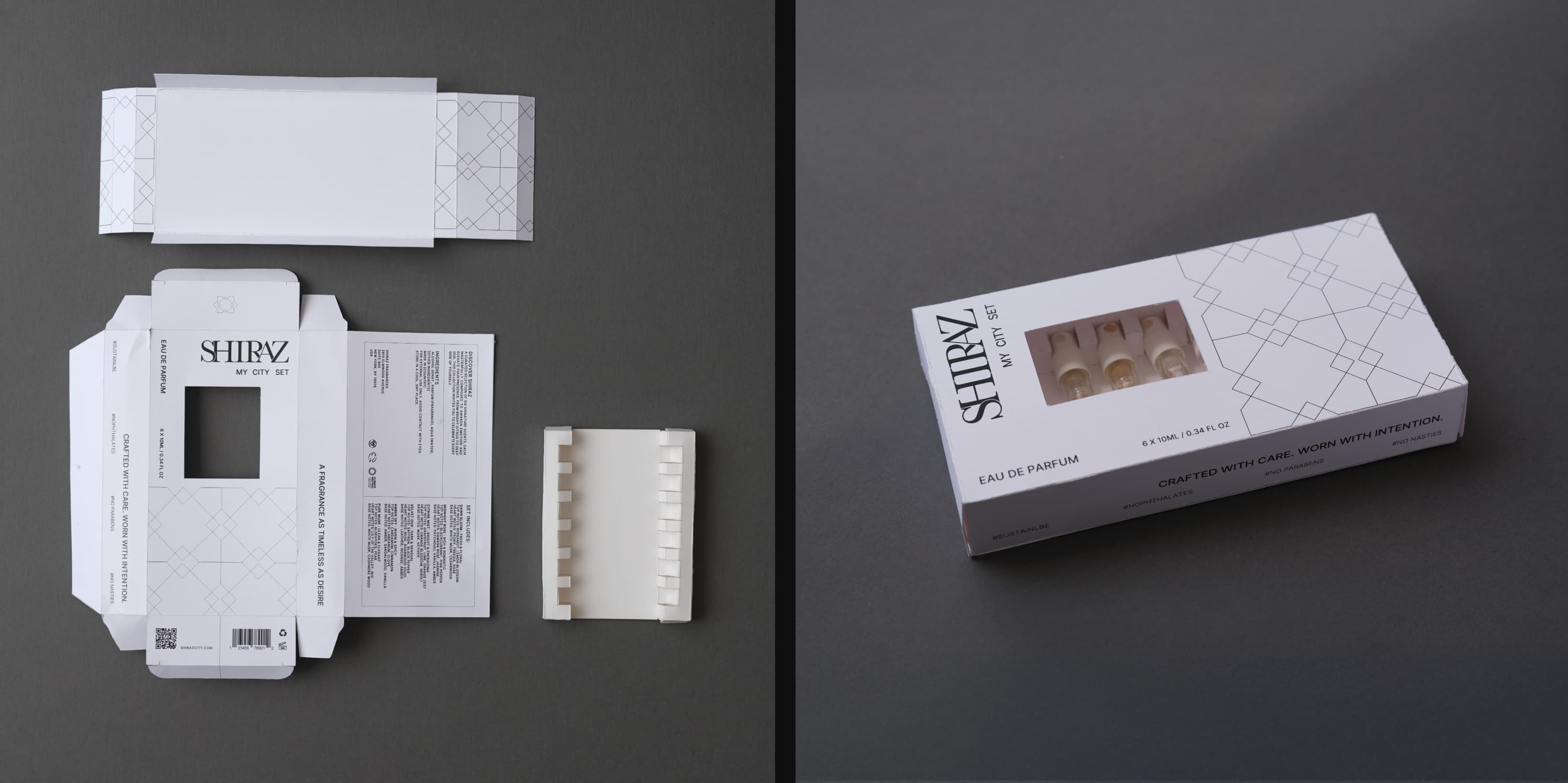 I focused on incorporating cultural patterns inspired by Shiraz City to add depth and a sense of heritage while maintaining a contemporary feel. A black-and-white palette with a subtle red accent, along with tone-on-tone Persian geometric patterns, creates a refined and distinctive visual language. This approach helps elevate the perceived quality of the product and builds a stronger emotional connection through cultural storytelling. By combining modern simplicity with heritage, the design responds to today’s market, where consumers are attracted to brands that feel authentic, clear, and visually sophisticated.